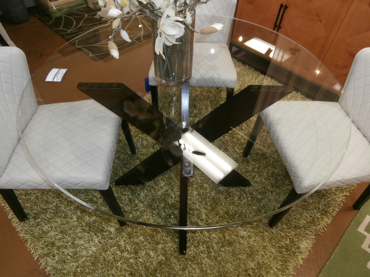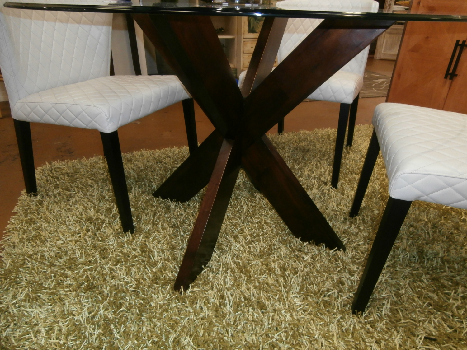 Glass top round dining table with wood criss cross base. Measures 48"DX30"H in brown.