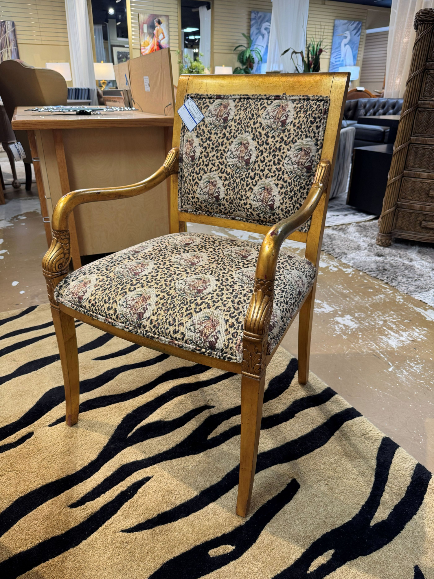 Ethan Allen regency style accent chair in a tropical animal patterned upholstery on gilded gold frame. 23"wide x 23"deep x 37"high. At posting, we have two.