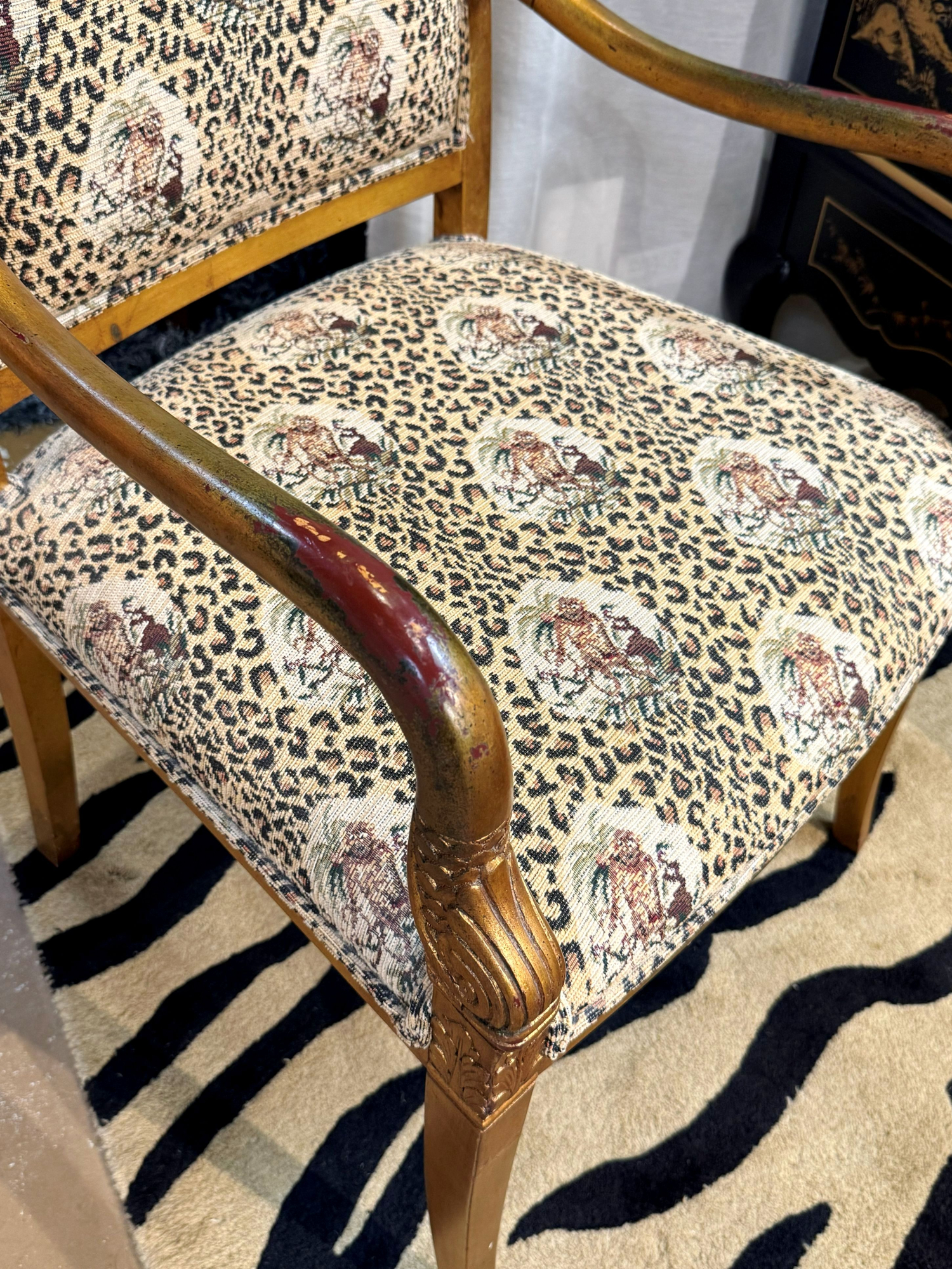 Ethan Allen regency style accent chair in a tropical animal patterned upholstery on gilded gold frame. 23"wide x 23"deep x 37"high. At posting, we have two.