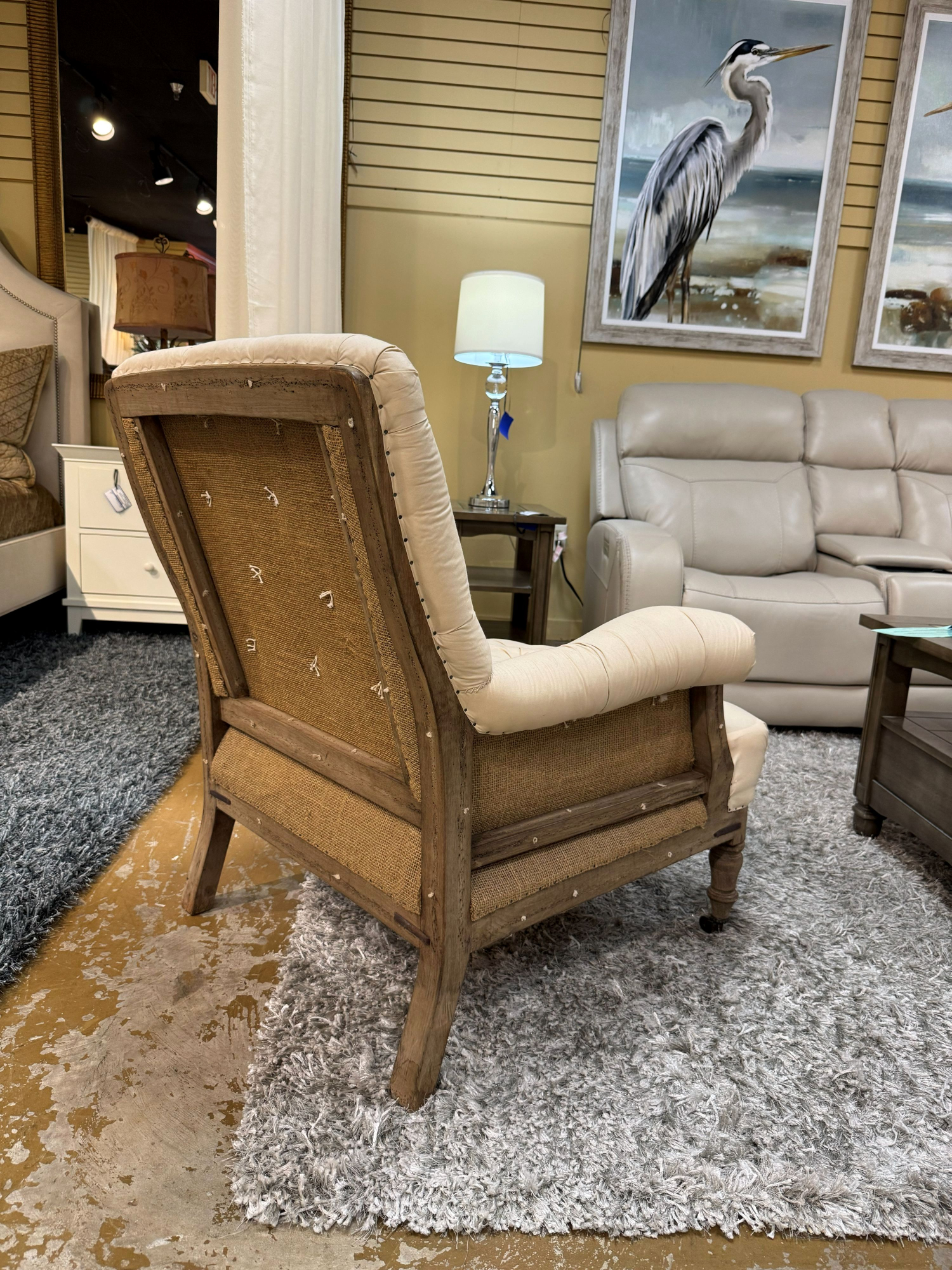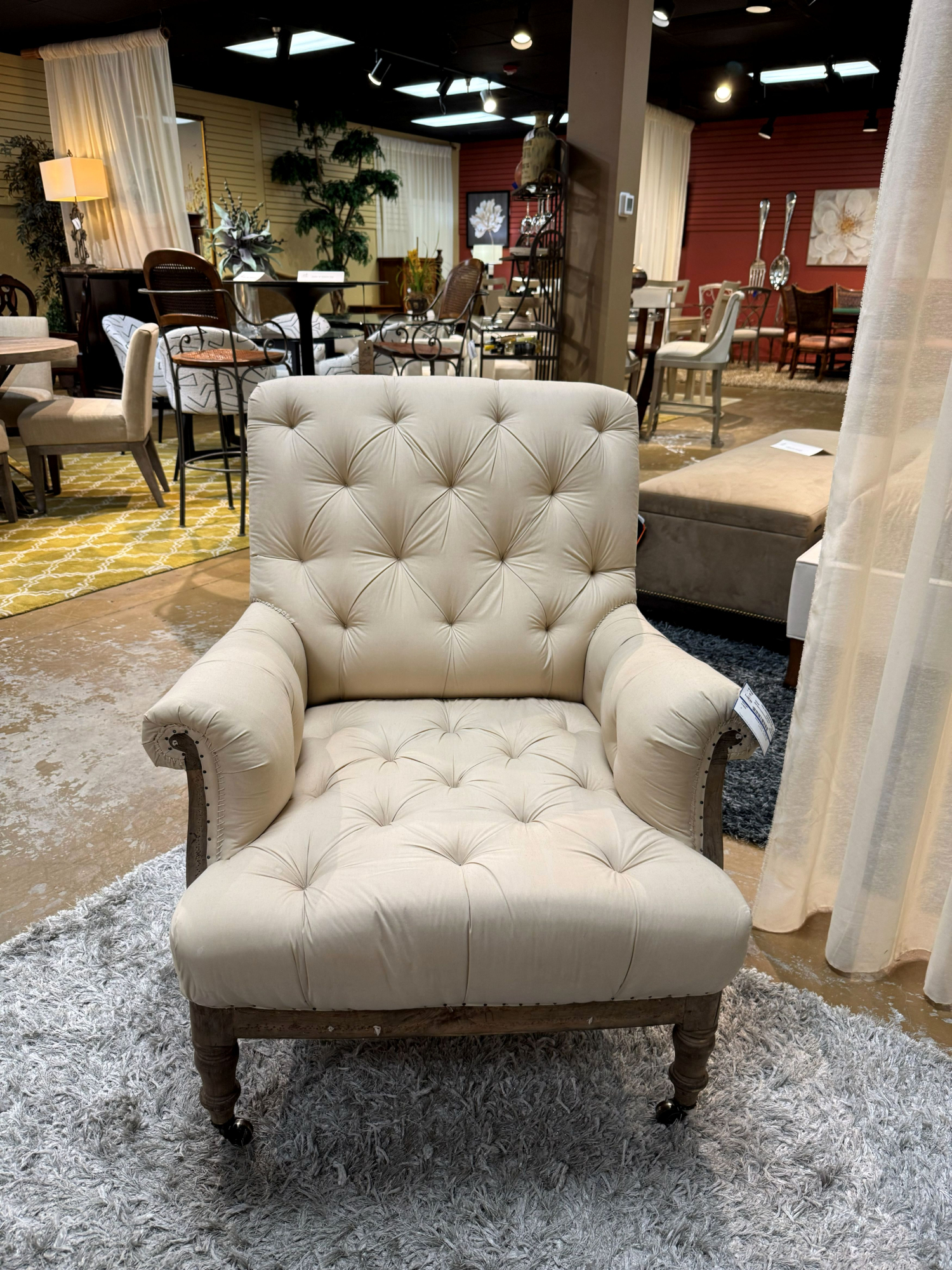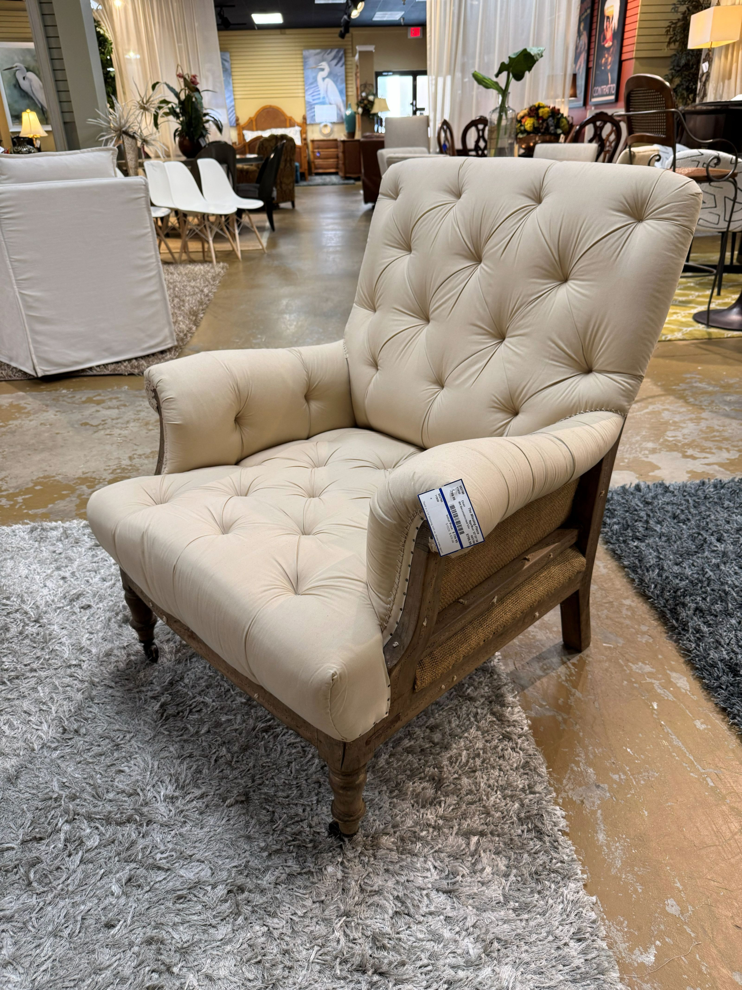 Restoration Hardware tufted roll arm chair with textured burlap back. Inspired by the unadorned beauty of the 19th century wing chair, the Van Thiels replicated Old World artistry with this piece. 32*32*36.