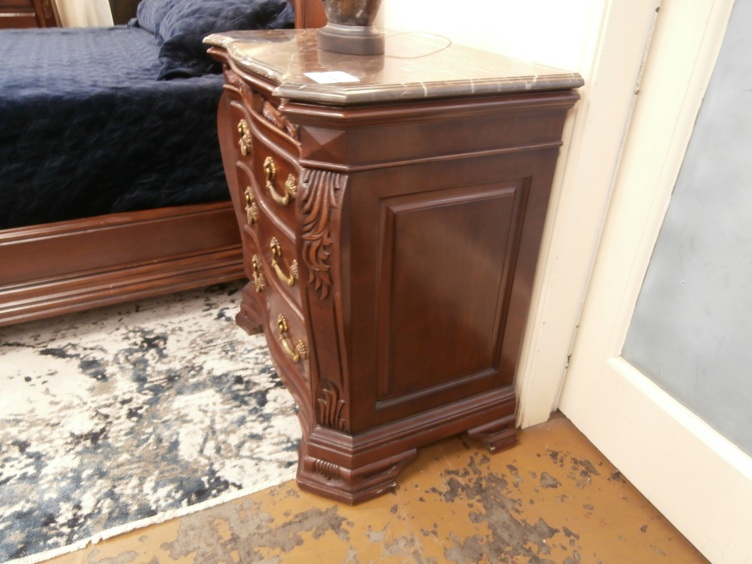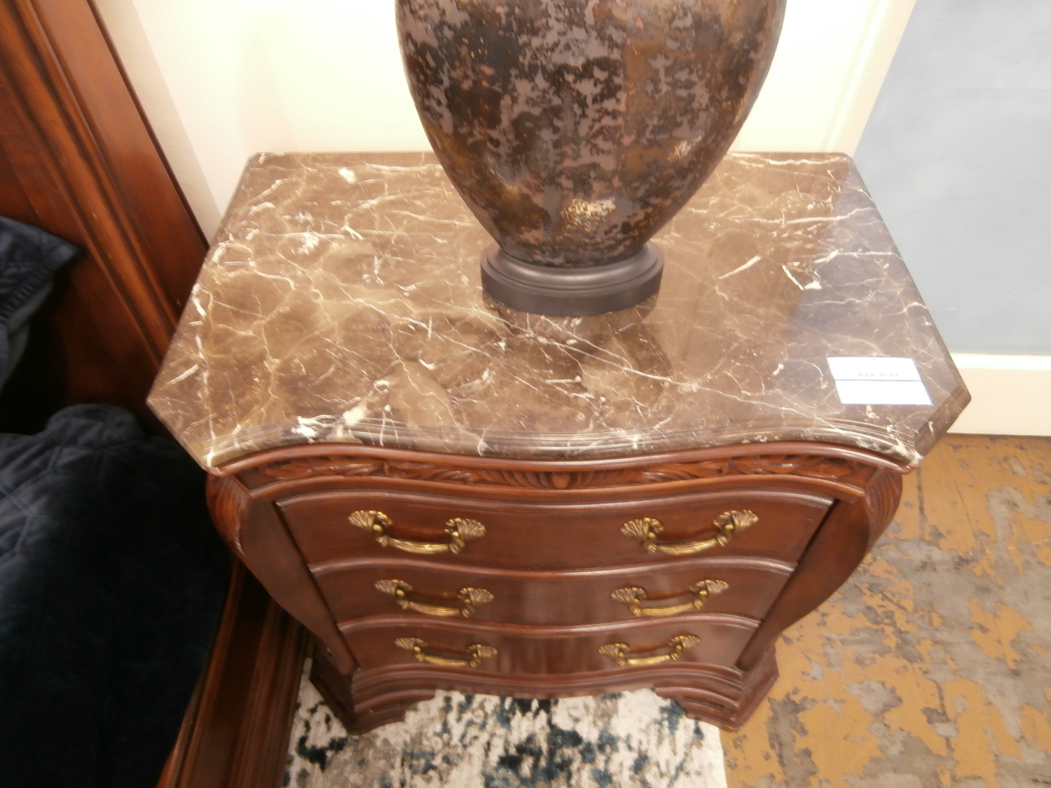 Bob Marley three drawer nightstand with stone top measuring 31"W,19,32"H in brown. Matching pieces at time of post.
