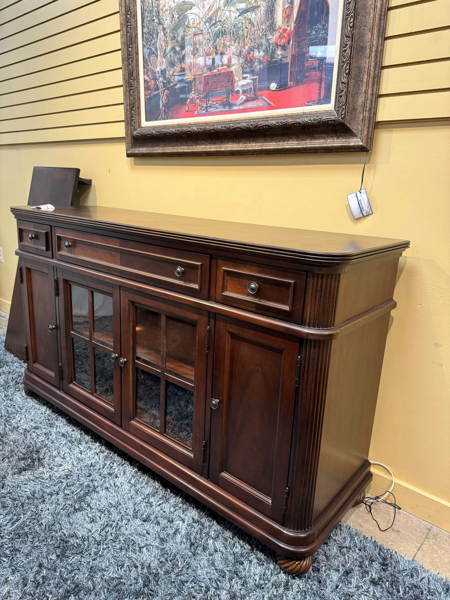 Legacy Classic buffet in a dark finish. There are three drawers with a shelf below. It is lit as well. Space for wine bottles on one side. 62"L x 19"D x 36"H. At posting, we have the matching dining set.