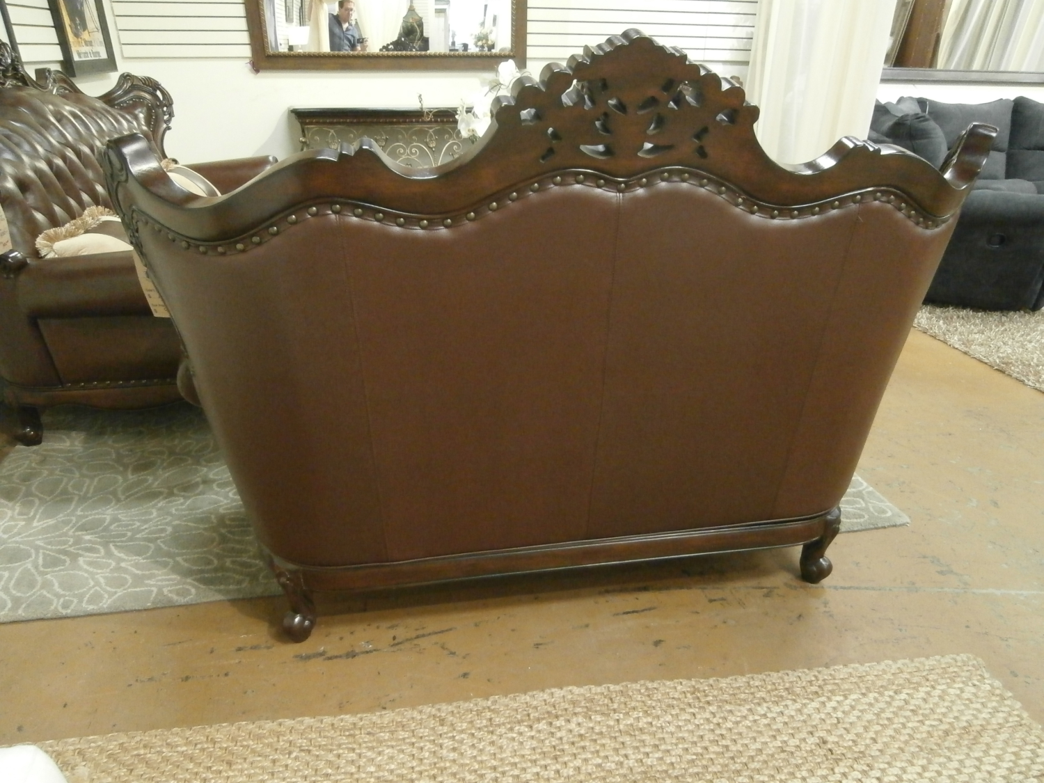 This Furniture of America Jericho piece has a dark oak finish, intricate wood trim, brown top grain leather match, rolled arms, button tufting. Measures 71"W,41"D,50"H with matching pieces at post.