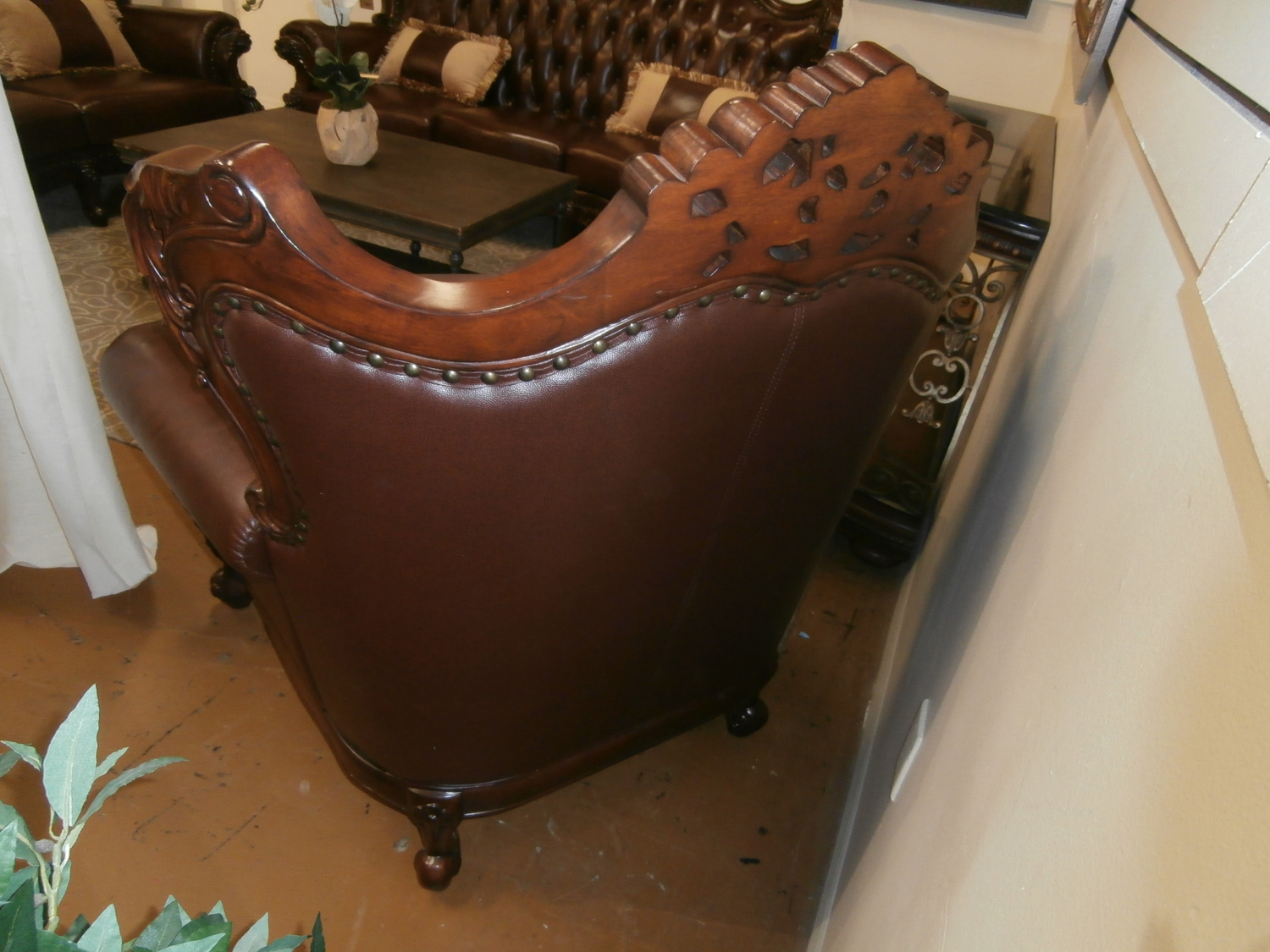 This Furniture of America Jericho piece has a dark oak finish, intricate wood trim, brown top grain leather match, rolled arms, button tufting. Measures 45"W,41"D,50"H with matching pieces at post.