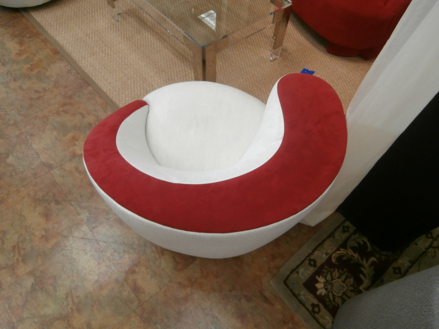 Eye popping chic Natilus upholstered swivel club chair with a combo of suede and fabric. Measures 37"W,37"D,29"H in red and white. Matching pieces at post.