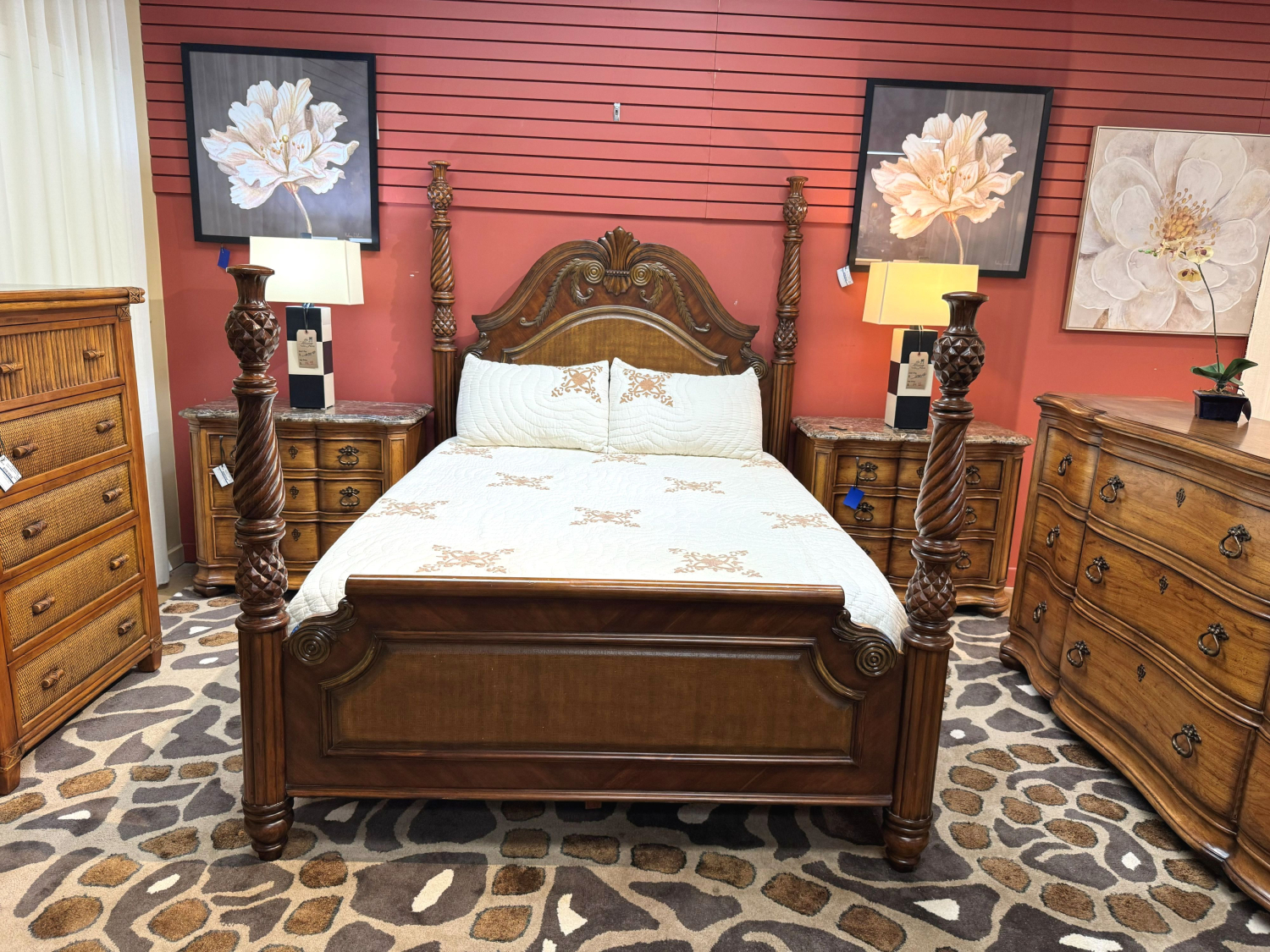 Tropical style carved wood four poster queen bed with woven inlaid headboard and footboard. Love pineapple detail in the posts.