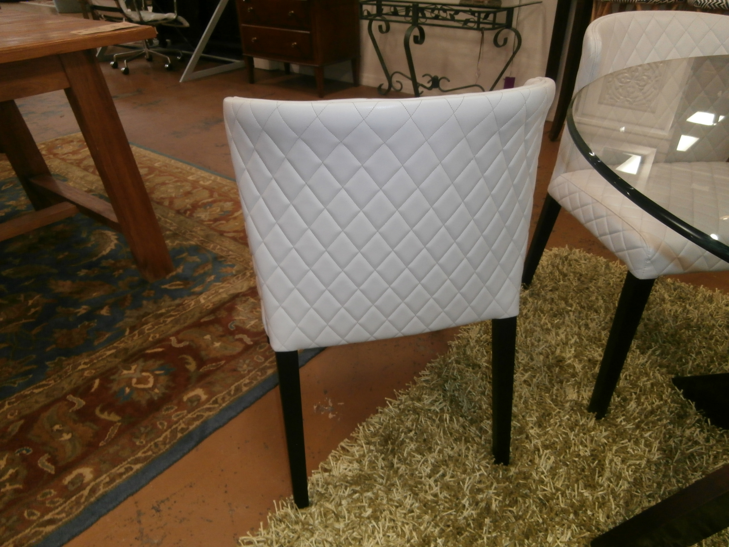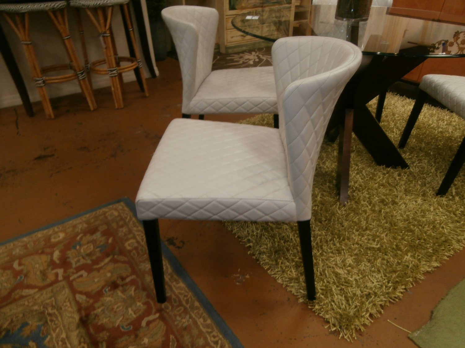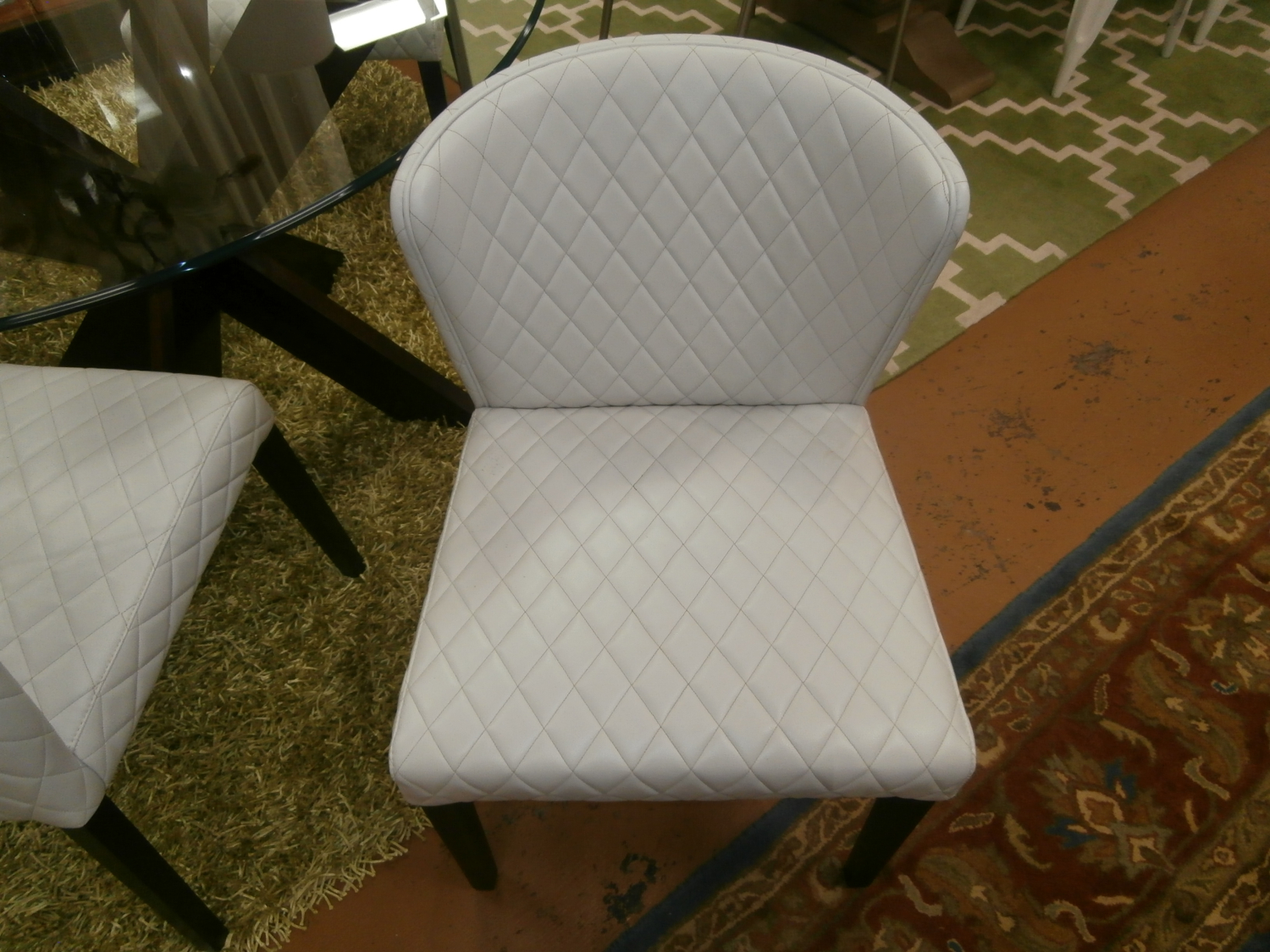 Set of four Crate & Barrel Curran quilted diamond stitch dining chair in a white synthetic leather and curved back. Measures 20"W,24"D,32"H.