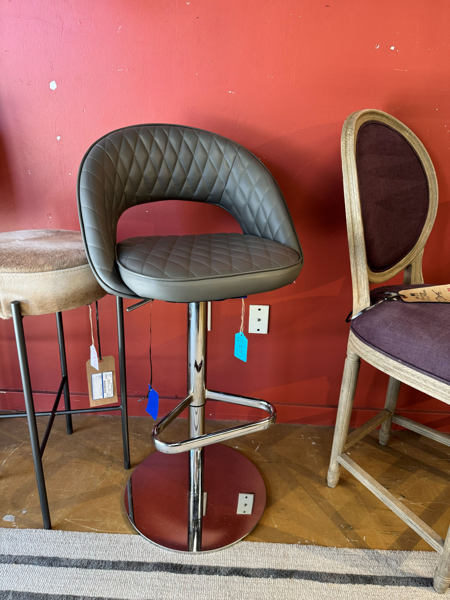 This is a set of three Sunpan contemporary style adjustable swivel barstools in a quilted gray faux leather upholstery on silver metal base. The seat height goes from 24" to 32"high.
