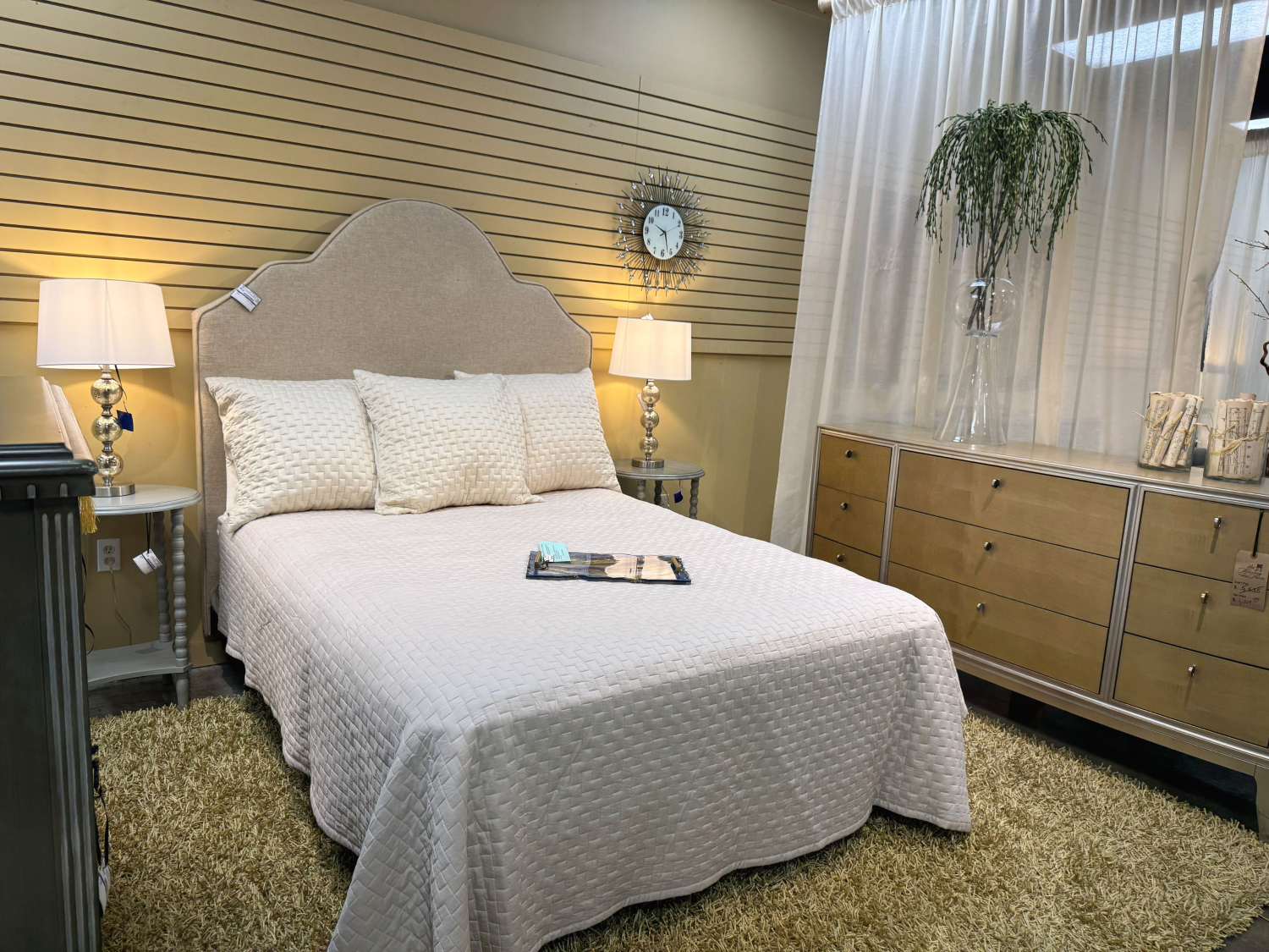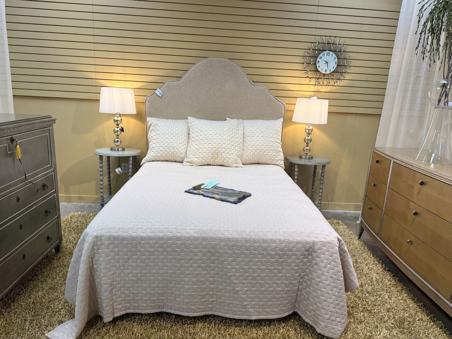 Forty West contemporary style queen sized headboard in a neutral wheat upholstery with nailhead trim. Comes with metal frame.