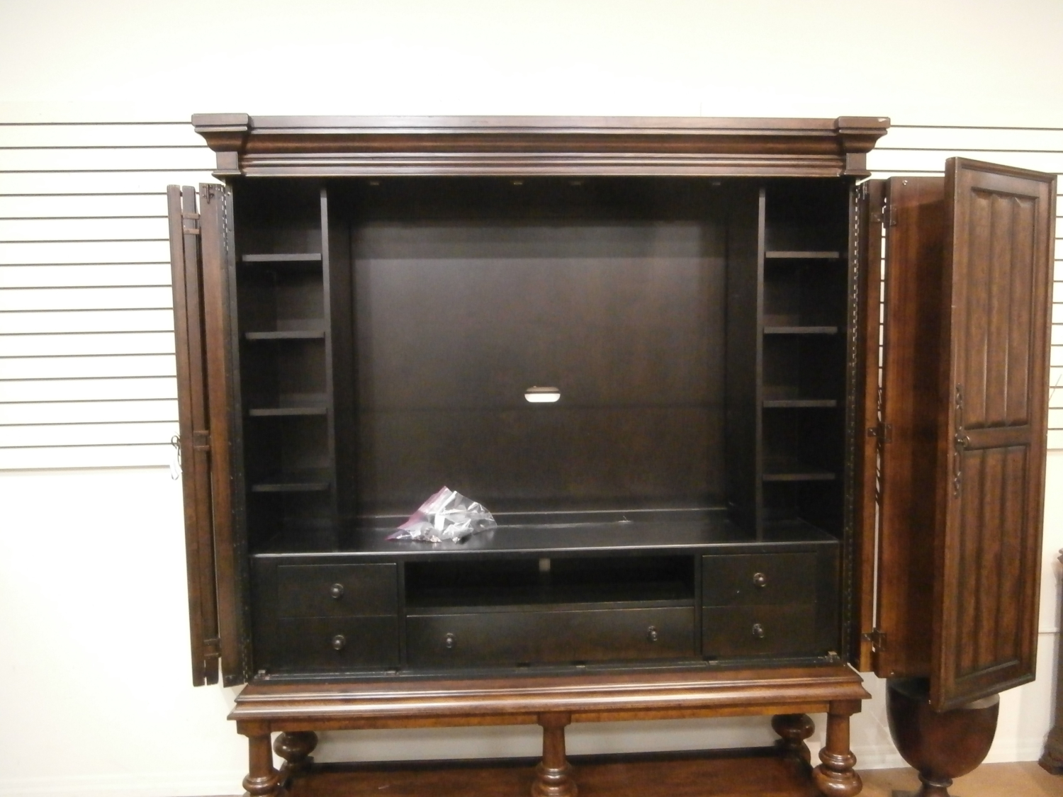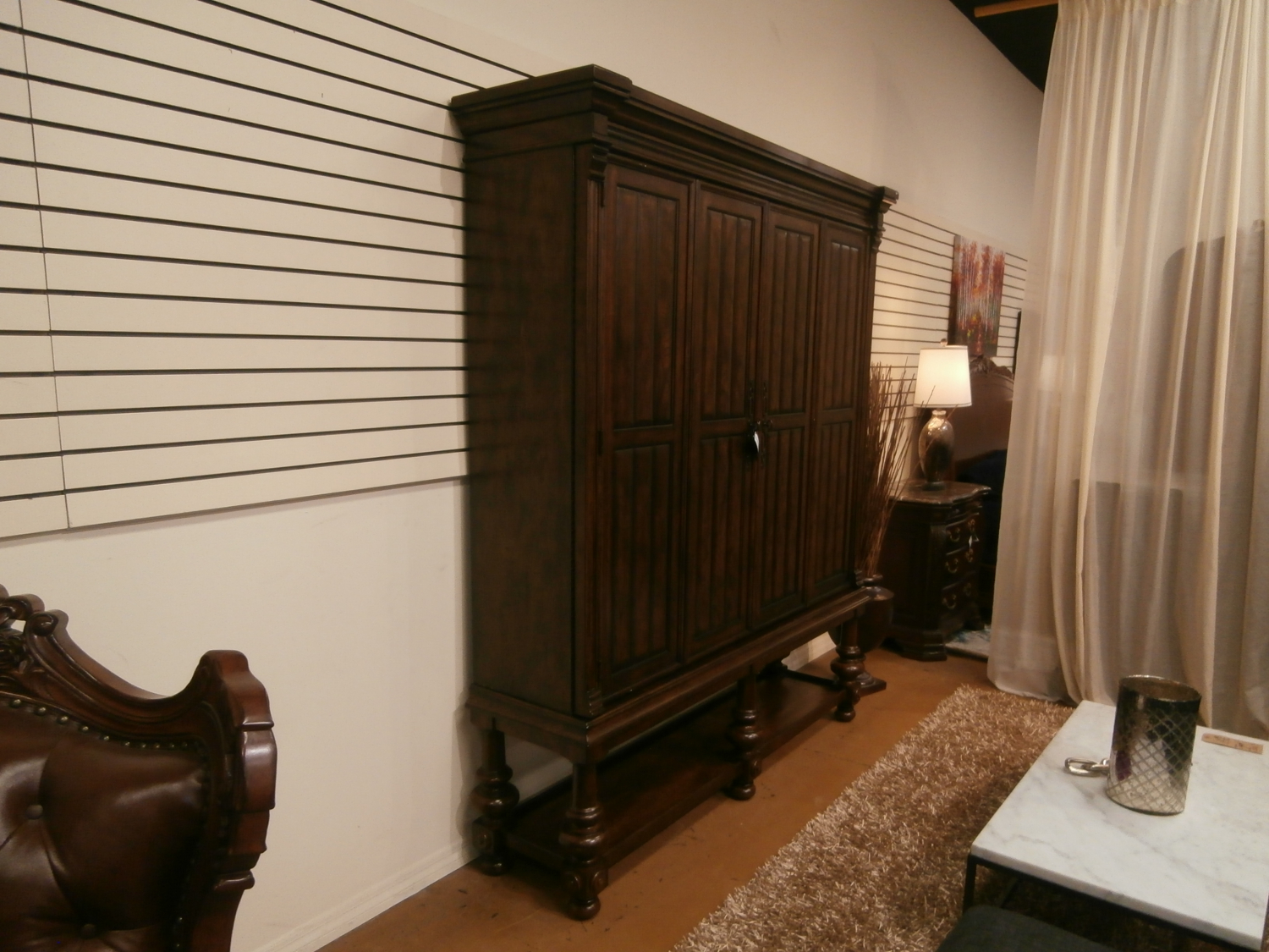 A.R.T. media cabinet with fold back doors and storage inside. Measures 74"W,19"D,88"H in mahogany.
