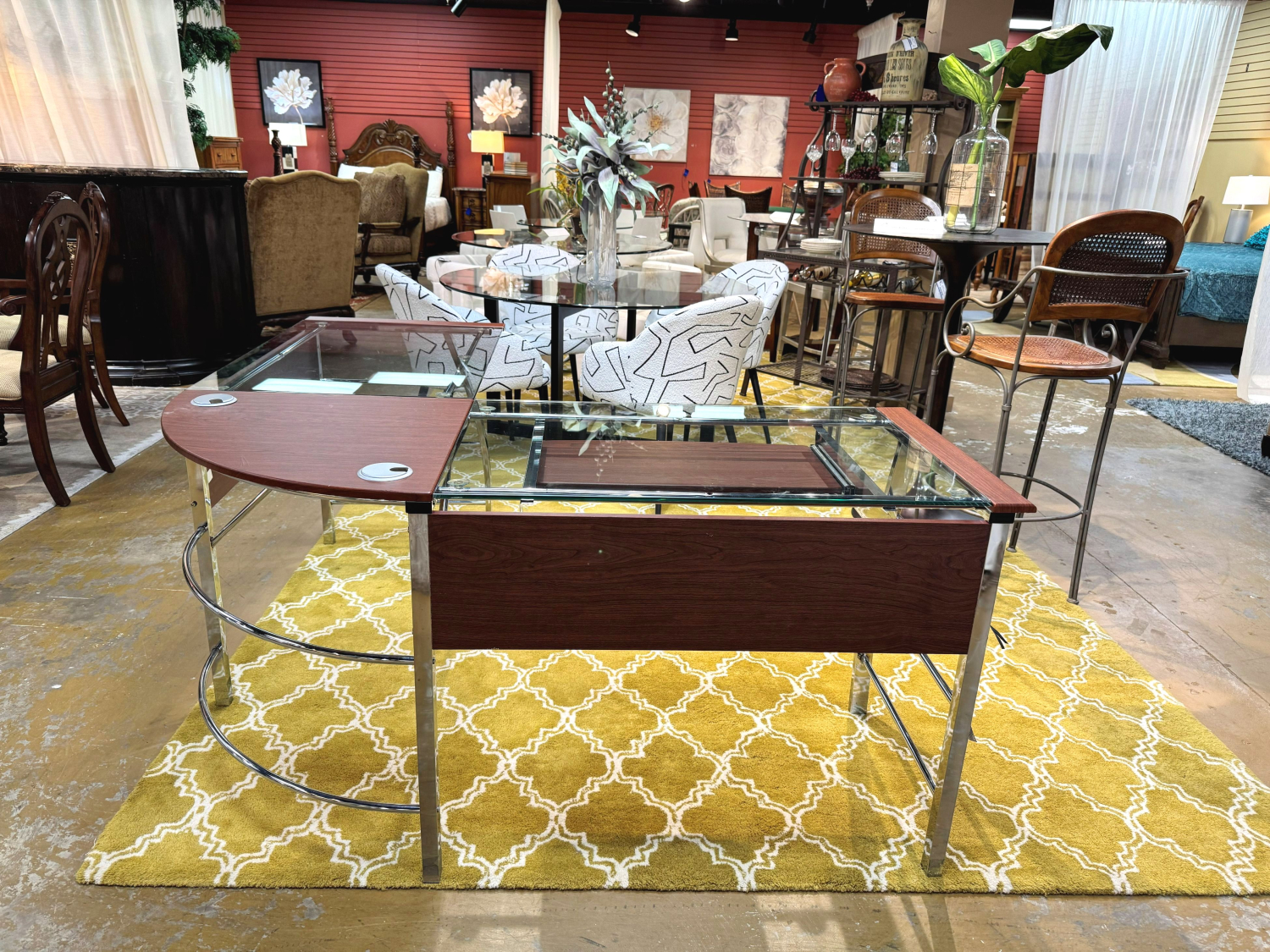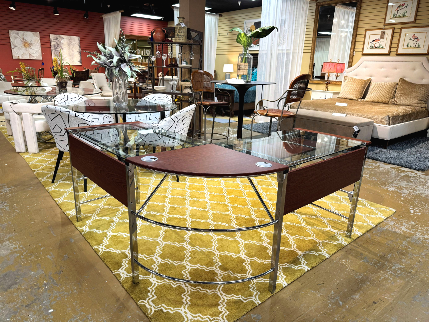 Realspace contemporary style L-shaped glass desk on silver metal frame. 62"long x 62"wide x 30"high.