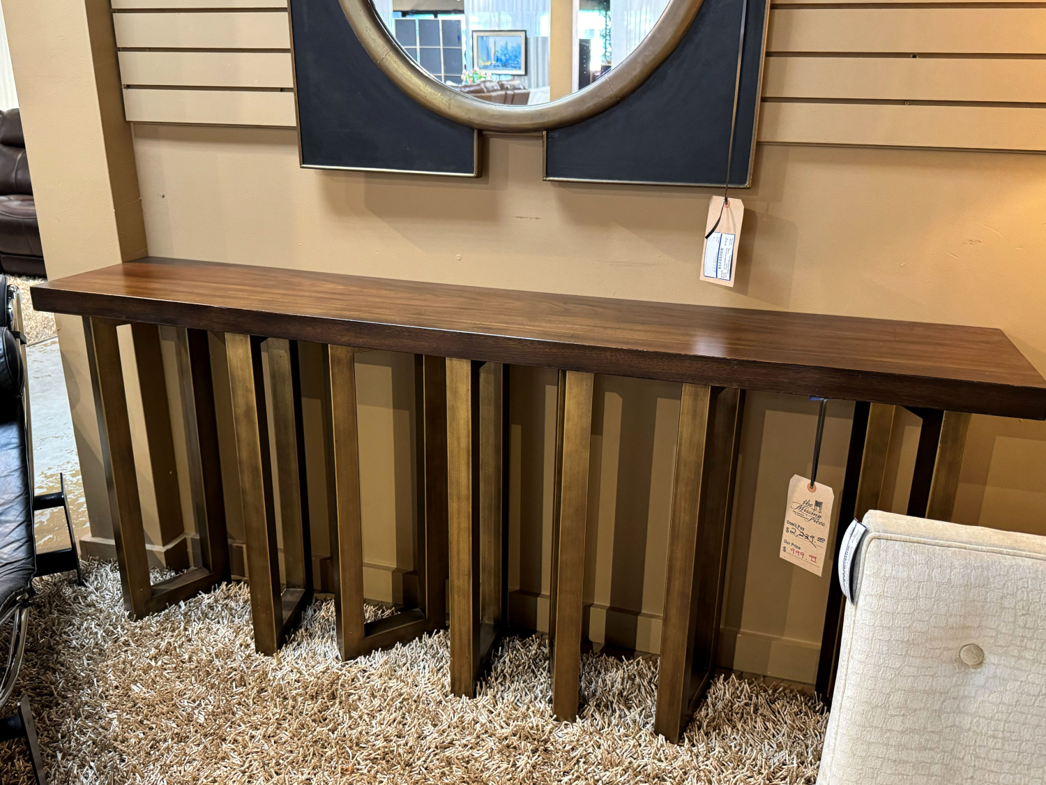 Hooker Connelly console table with a cathedral black walnut veneer top on a sculptural metal base in a soft, earthy gold finish. Gorgeous! 72"long x 14"deep x 32"high.