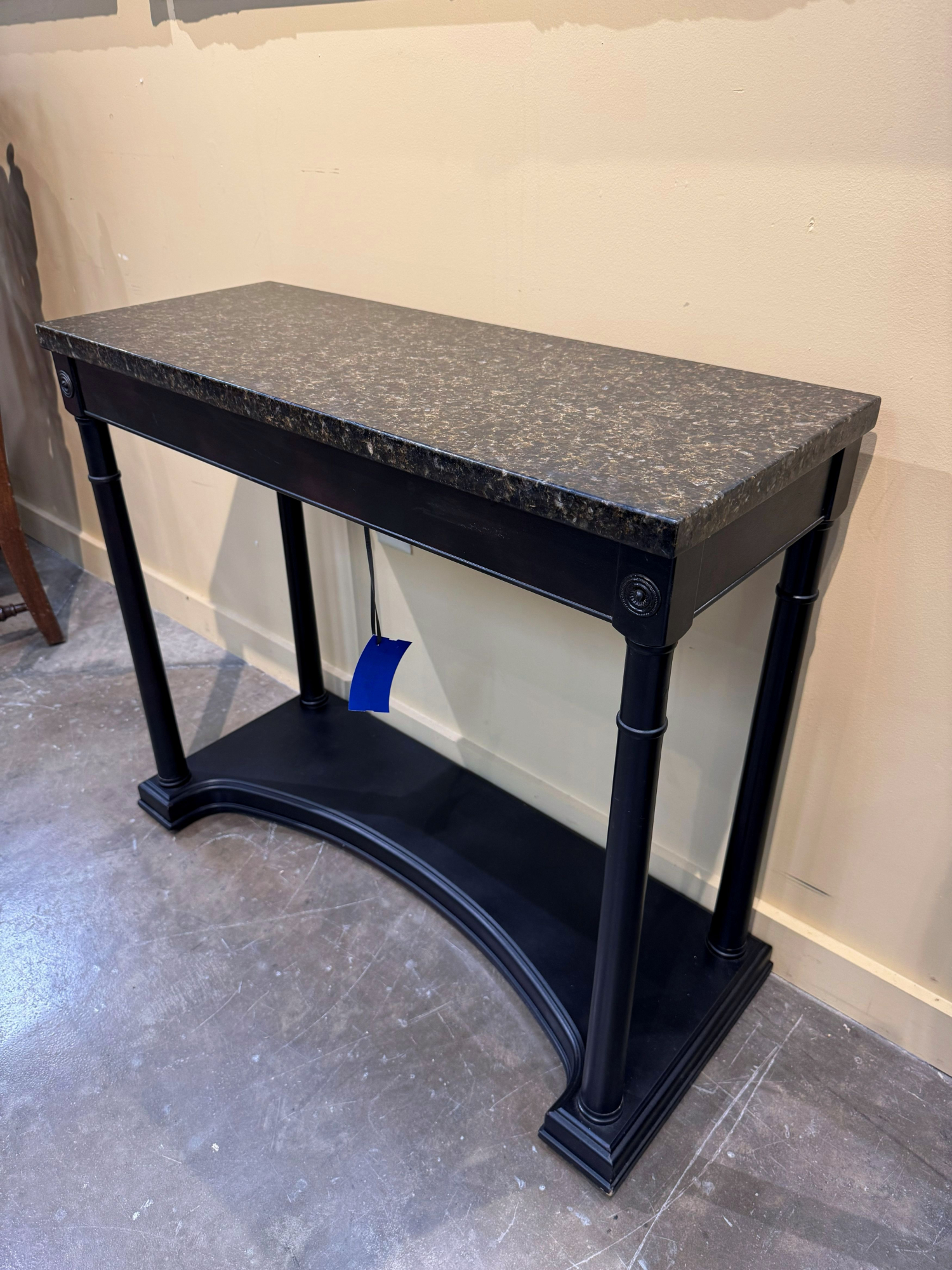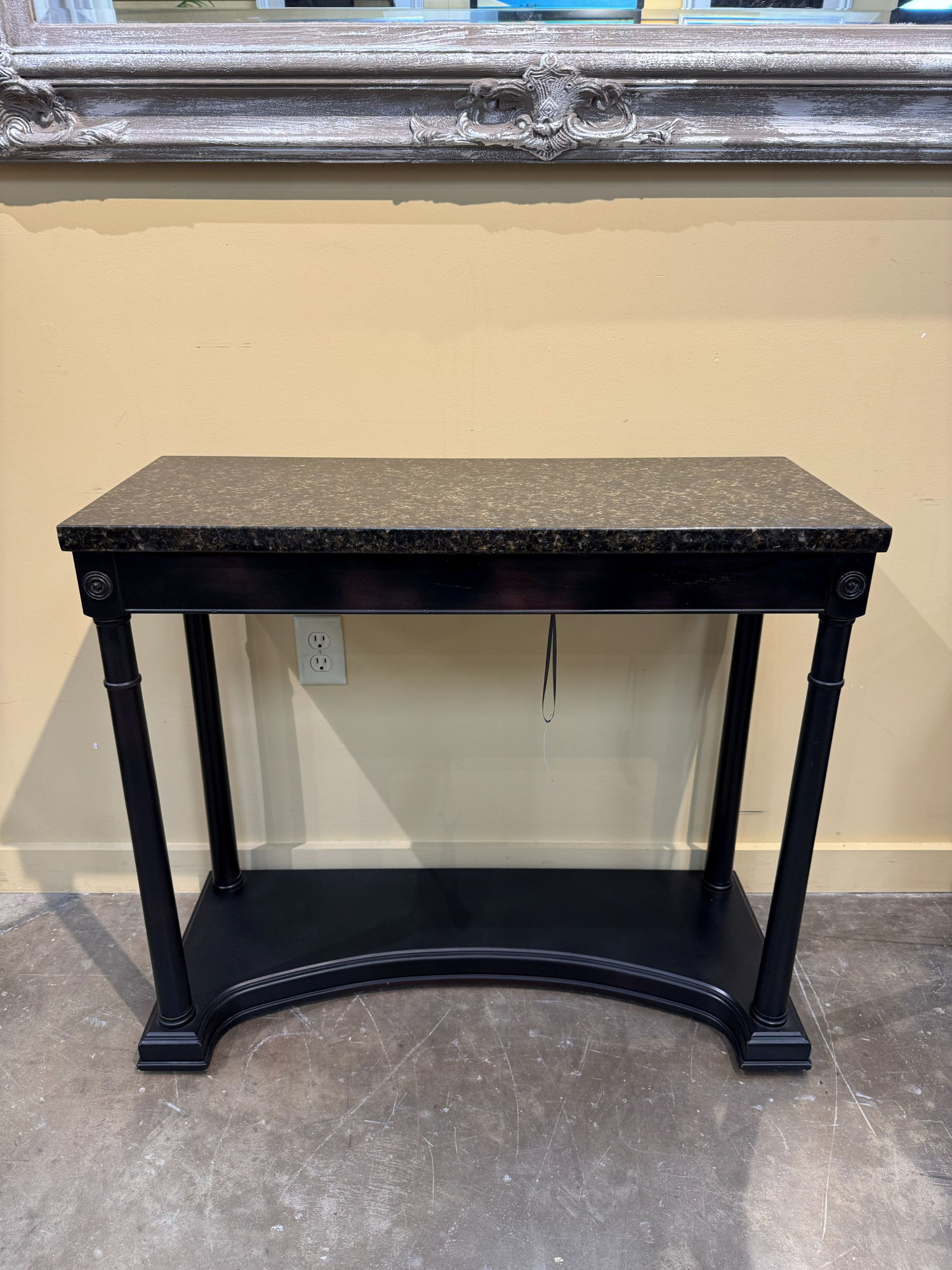 Bombay company traditional style stone top accent table in black. There is one small shelf below. 35"long x 14"deep x 31"high.