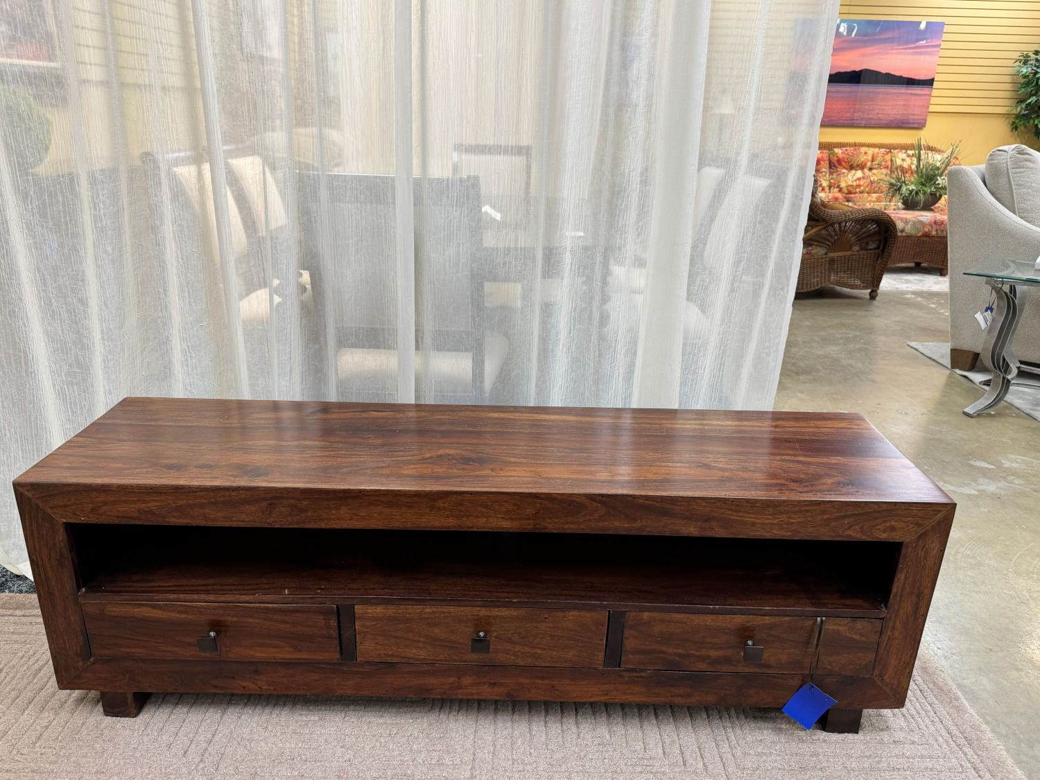 Rustic low media console in a dark finish. There is open cubby space above with three drawers below. 63"long x 16"deep x 20"high.
