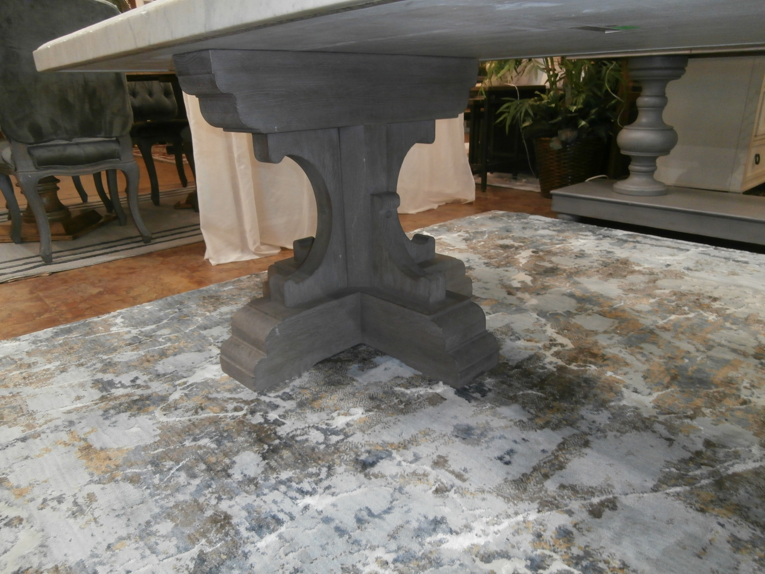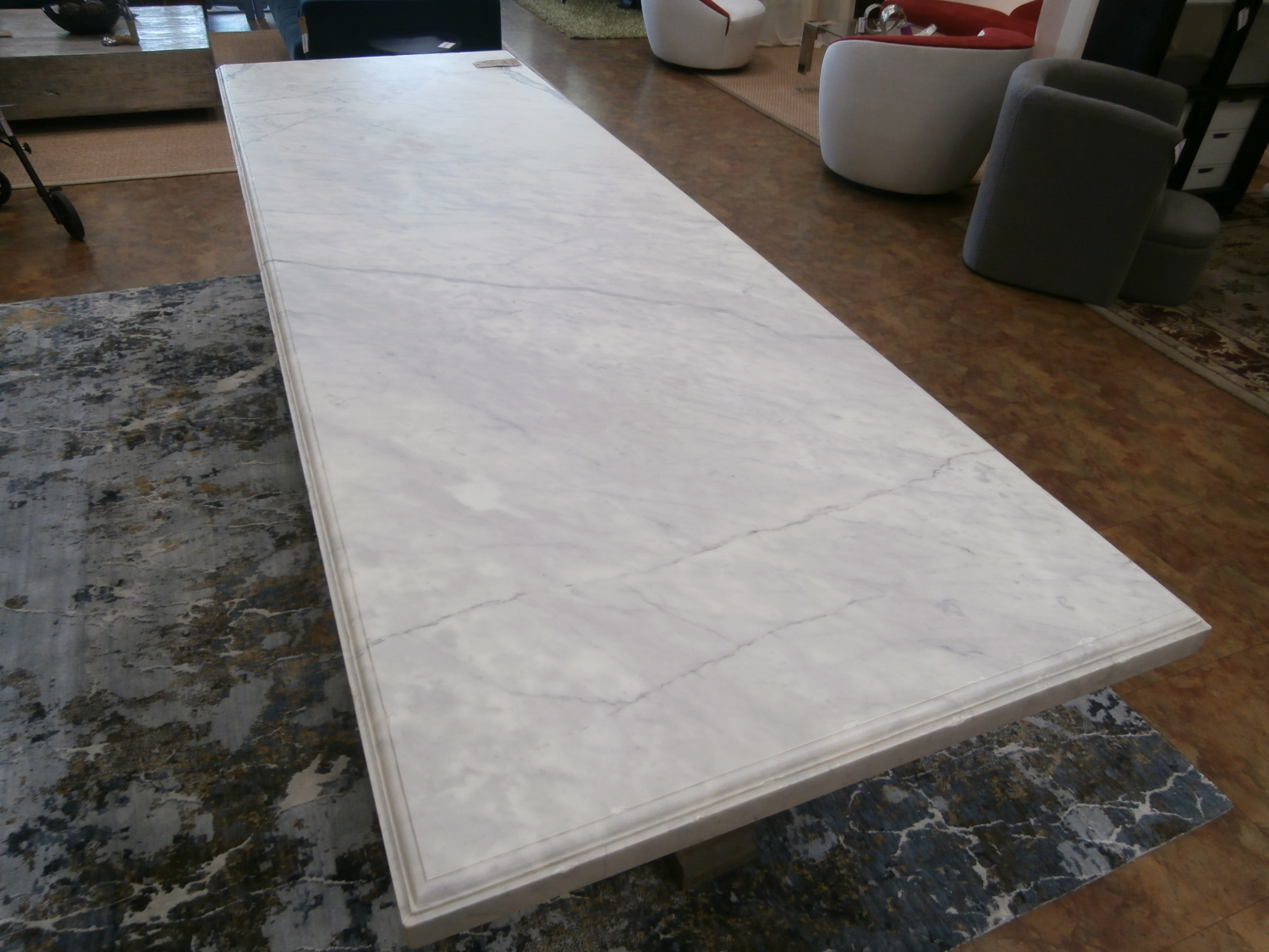 Evoking of turn-of-the-century design, this table from designer Geoffrey Hawkes is distinguished by a hand-carved, stepped base and a hand-turned baluster beneath a tabletop of honed Carrara marble. Measures 120"W,40"D,30"H.