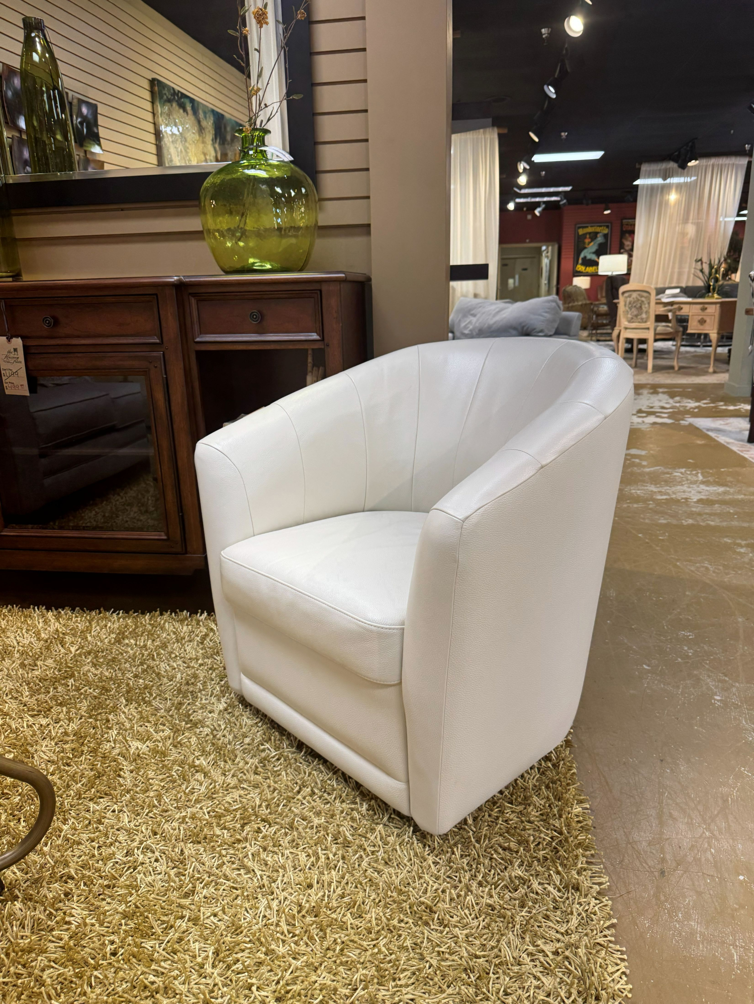 Kanes Stefano contemporary style swivel tub chair in a white leather. Measures 31"wide x 30"deep x 33"high. At posting, we have two.