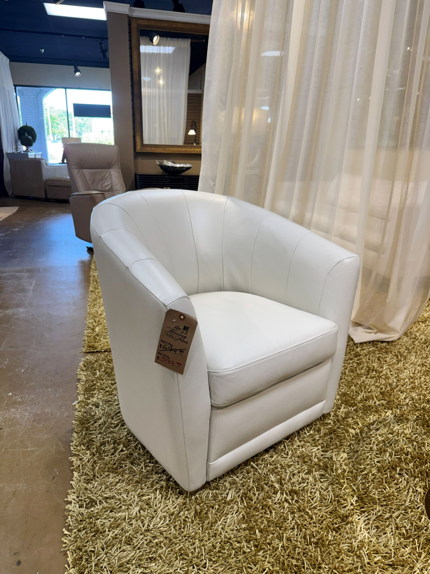 Kanes Stefano contemporary style swivel tub chair in a white leather. Measures 31"wide x 30"deep x 33"high. At posting, we have two.