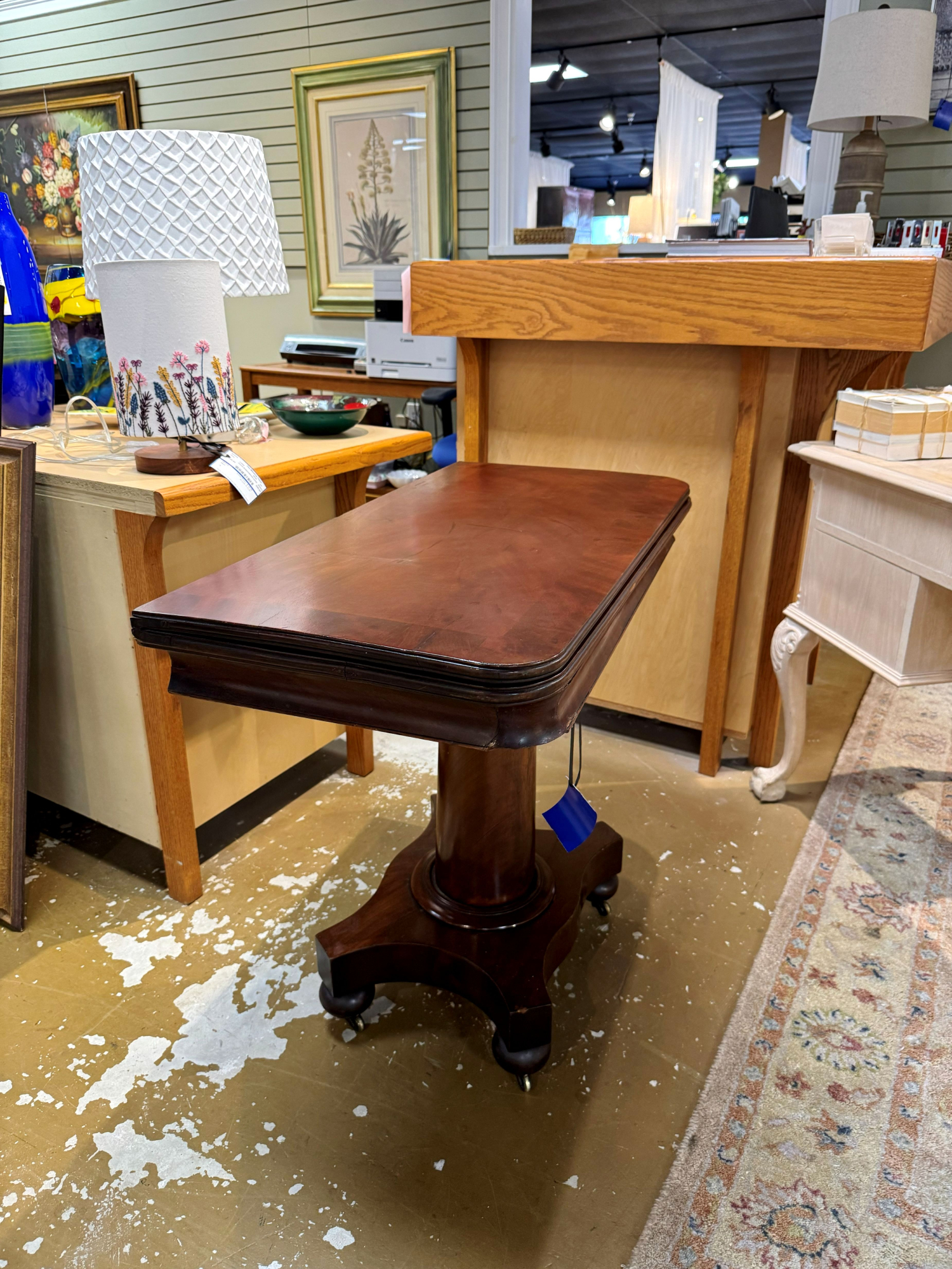 Vintage mahogany flip top table with pedestal base on casters. The top rotates and opens to provide a larger surface. 35"long x 17"wide x 30"high.