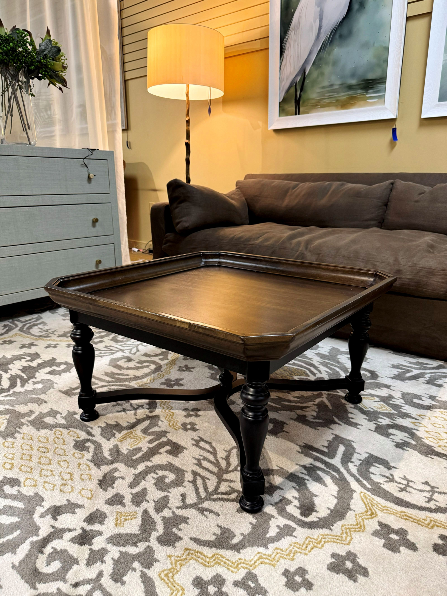 Pier 1 rustic or farmhouse style coffee table with dark wood top on black legs. 36"square x 18"high.