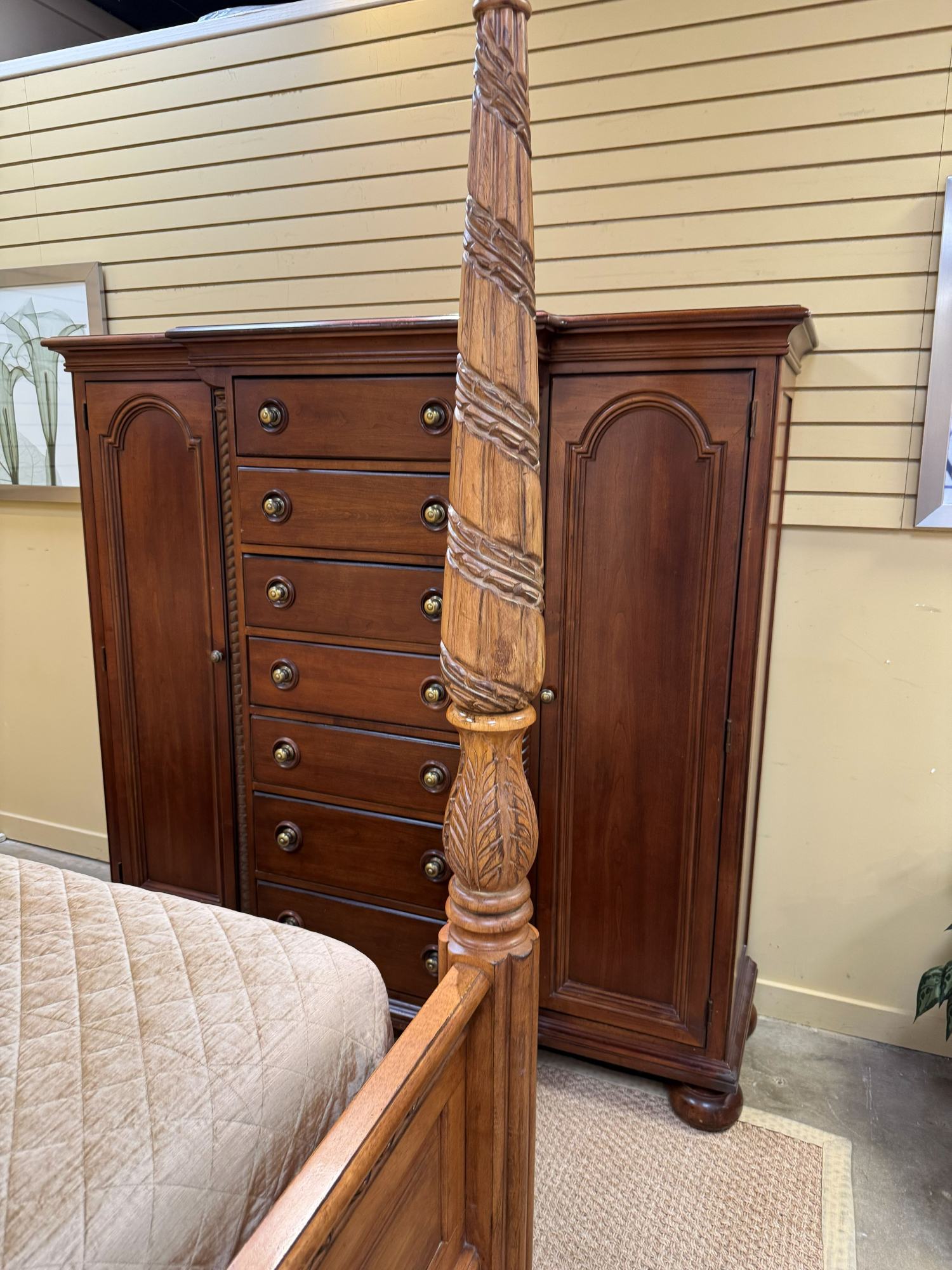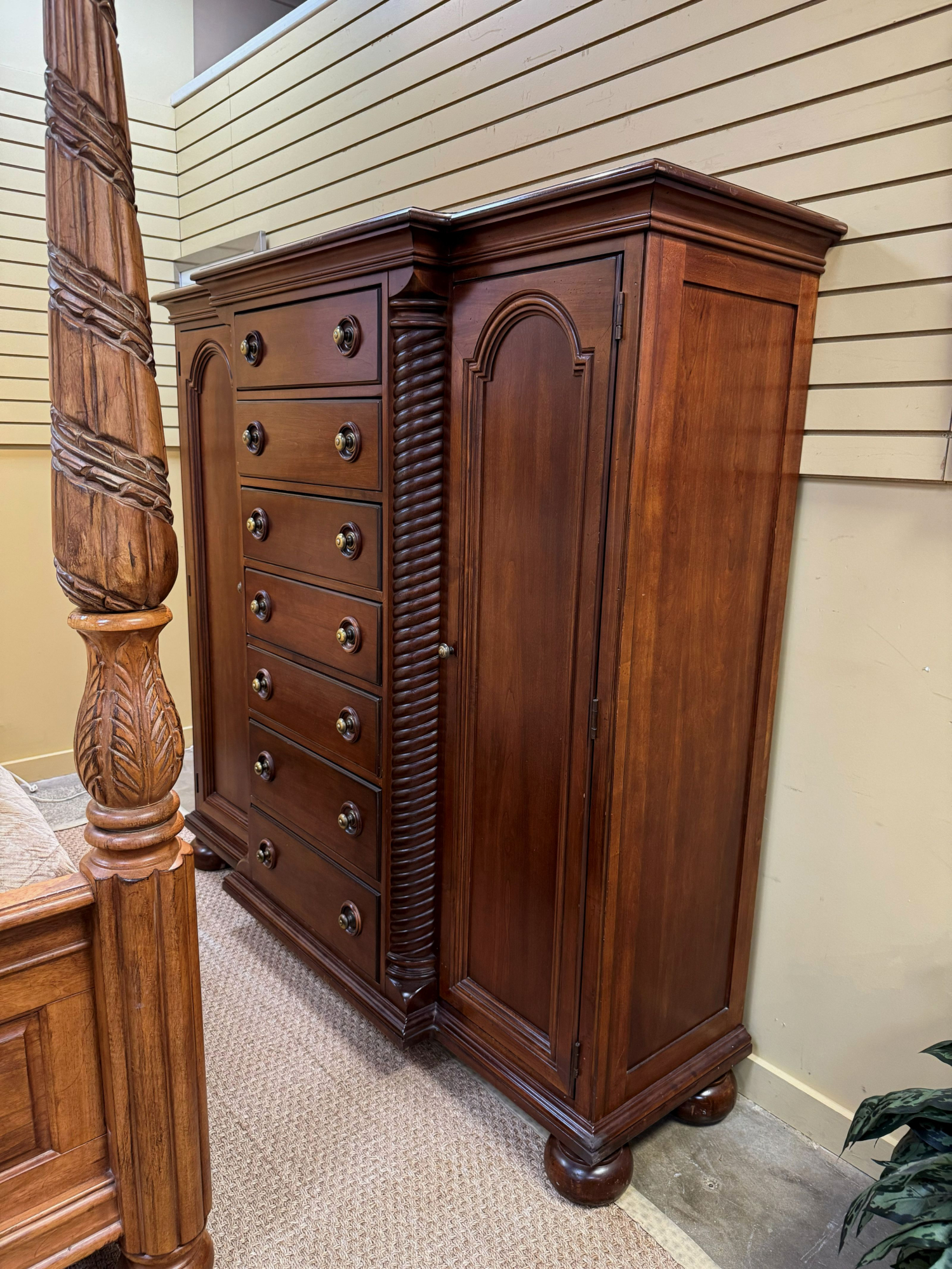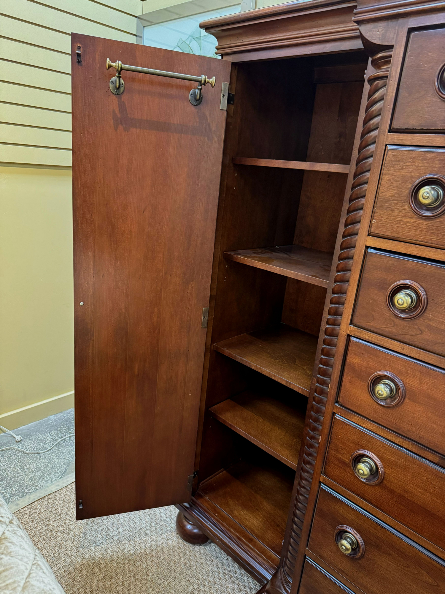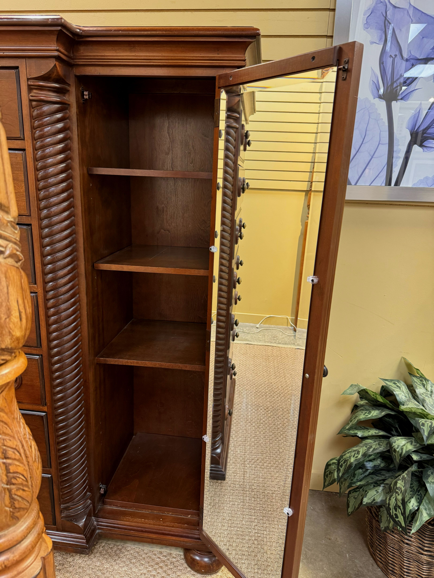 Nautica gentlemans chest in a dark finish. There are seven drawers down the center with four shelves behind each door. There is a small wardrobe bar inside one door & a mirror on the other. 69"W x 22"D x 66"H.