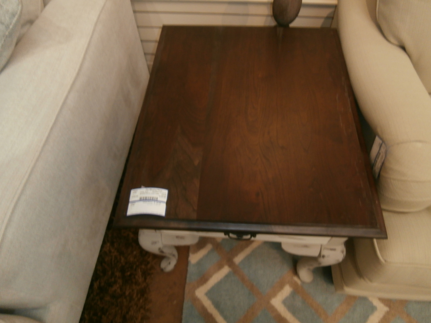 Broyhill rustic wooden end table with a single drawer and cabriole legs. Measures 27"W,22"D,23"H in brown and white two at time of post.