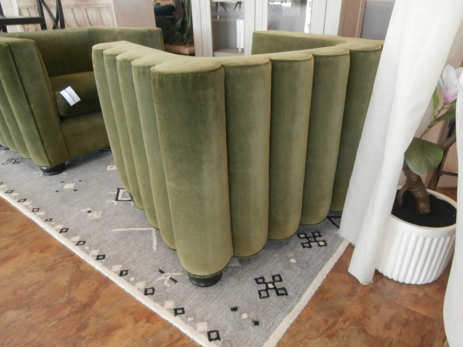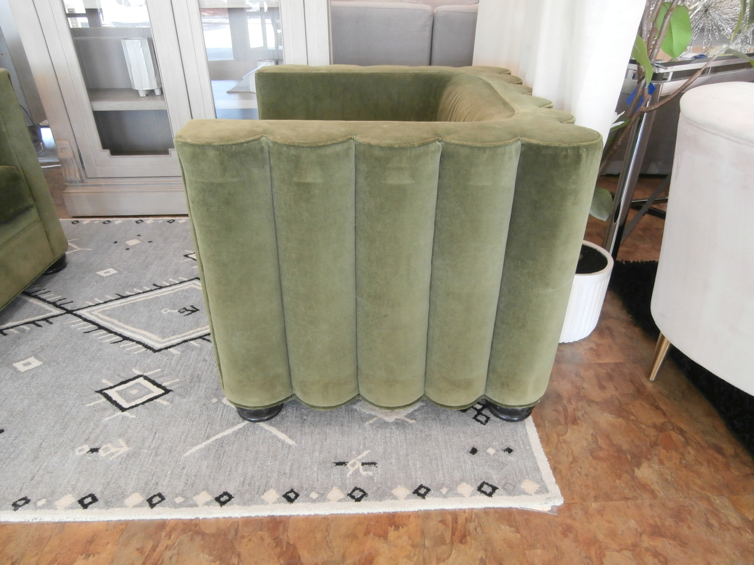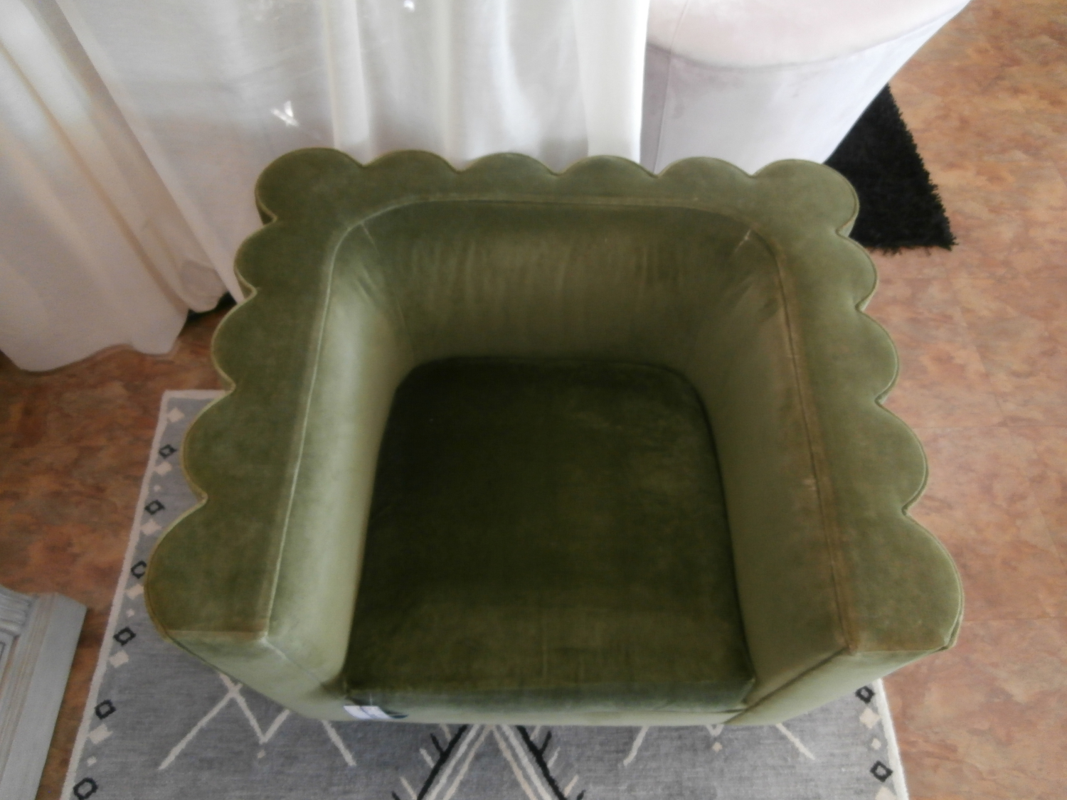 Antwerp scalloped club chair measuring 36"W,31"D,27"H in a velvety moss. Two at time of post.
