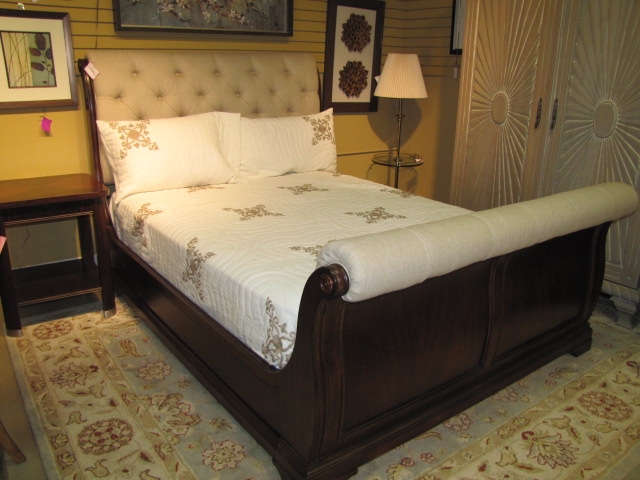 Beautiful tufted Margaux queen bed. Creme color upholstery.